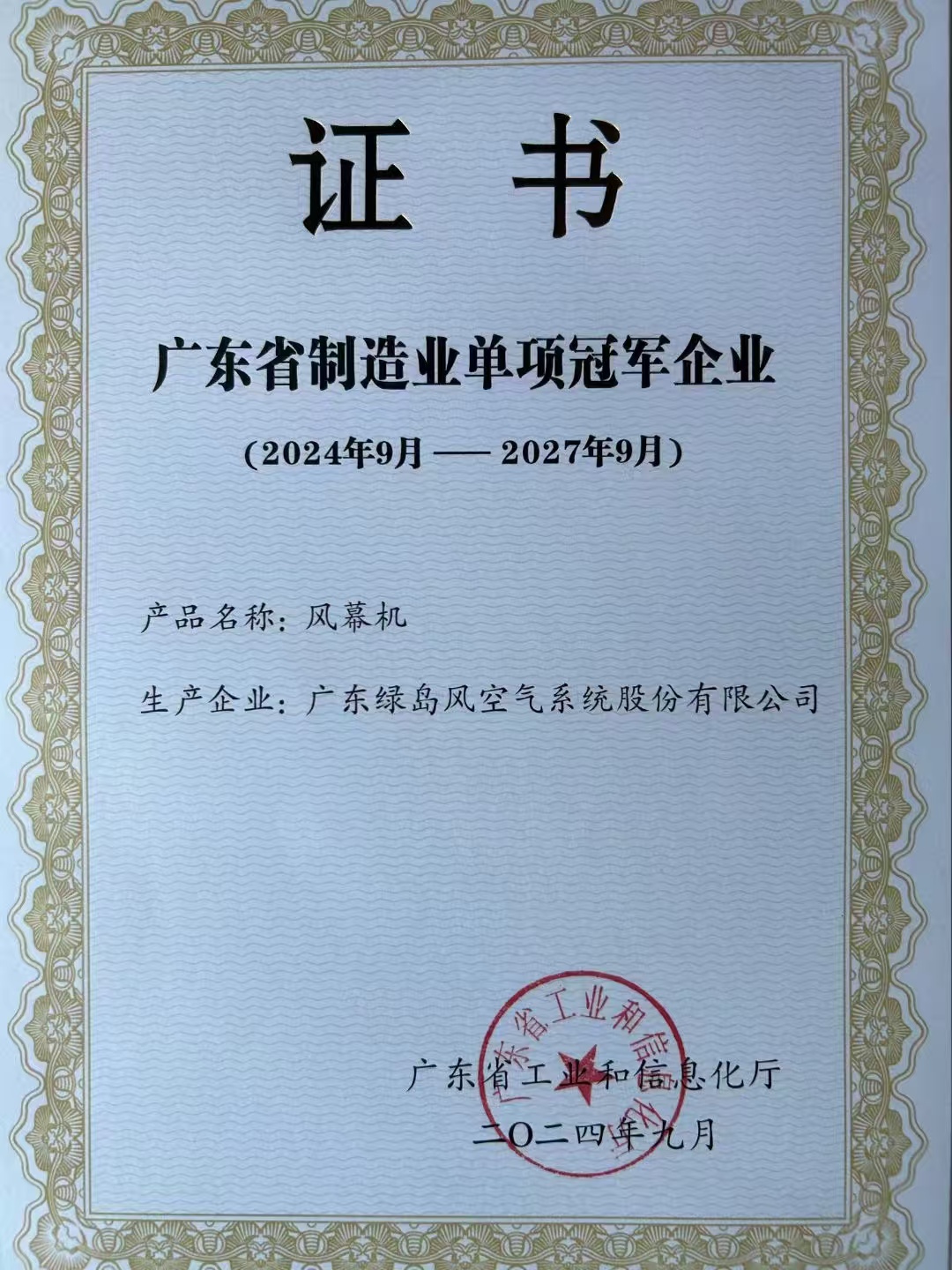 綠島風(fēng)榮獲“2024年廣東省制造業(yè)單項冠軍企業(yè)”